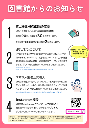 ※甲南子育てひろば(子ども室)・総合こども学科コモンルームの資料は、アプリでは貸出できません。